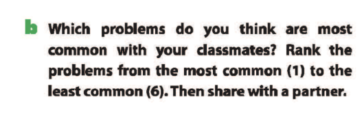 Which problems do you think are most common with your classmates? Rank the problems from the most common (1) to the least common (6). Then share with a partner.