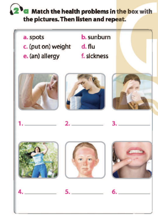 Bài 2. Match the health problems in the box with the pictures. Then listen and repeat.