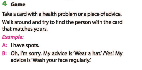 Bài 4. Game: Take a card with a health problem or a piece of advice. Walk around and try to find the person with the card that matches yours.