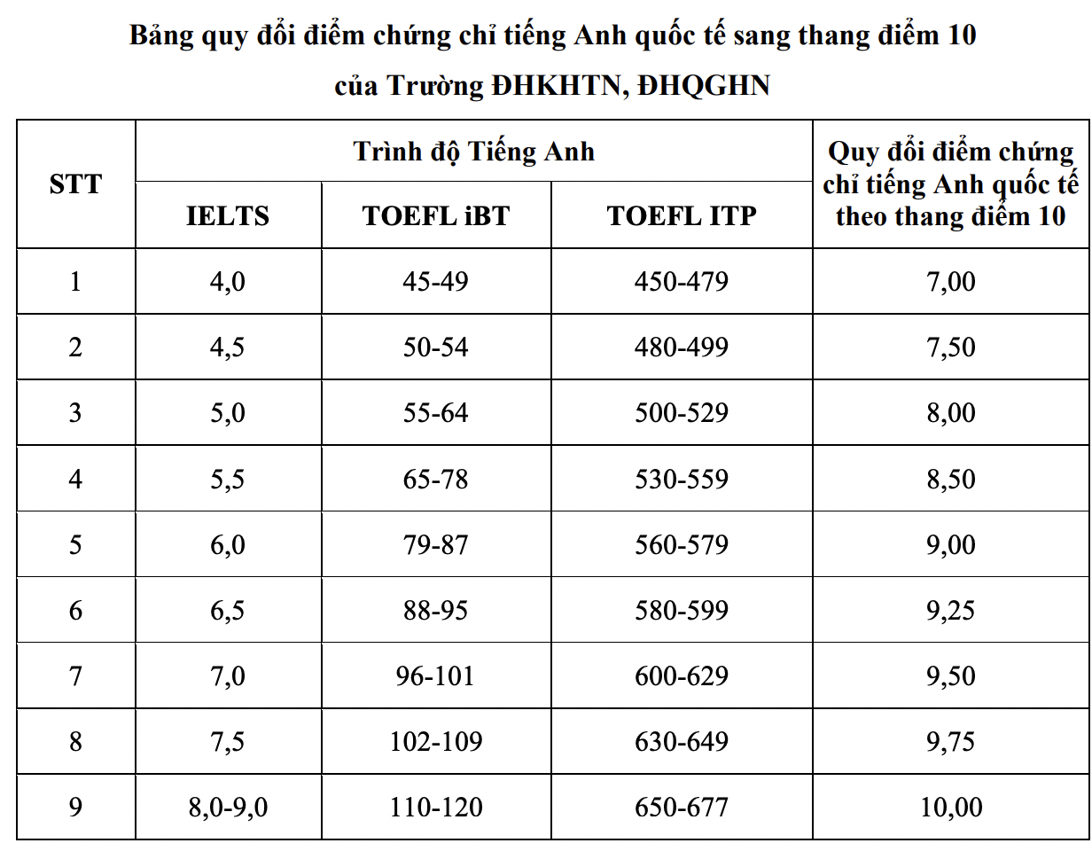 - Với những thí sinh đã đạt chứng chỉ tiếng Anh quốc tế theo quy định, điểm tiếng Anh được quy đổi sang thang điểm 10 thay cho môn tiếng Anh làm điểm xét tuyển hoặc làm tiêu chí phụ vào Trường Đại học Khoa học Tự nhiên: