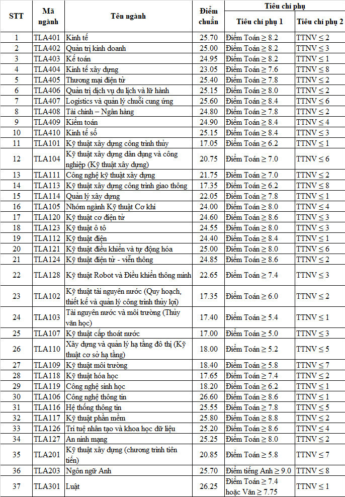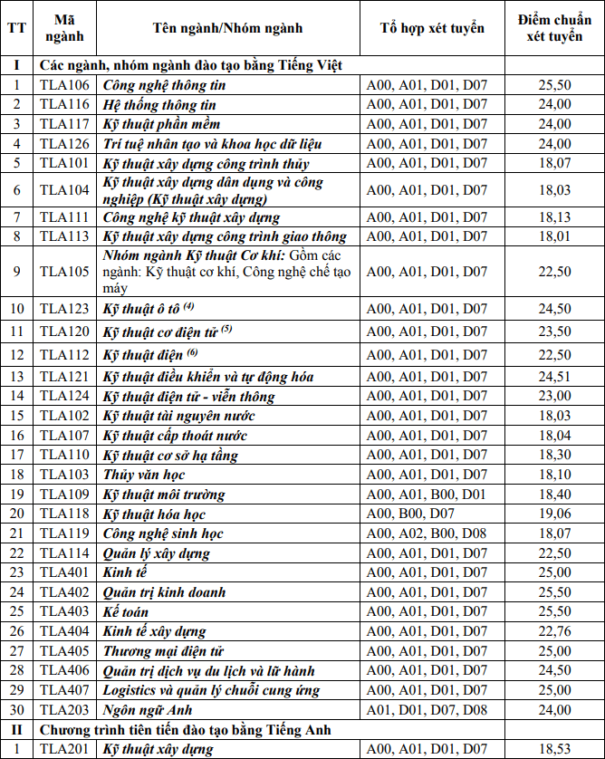 | Quản lý xây dựng | TLA 114 | 77 | 33 | A00, A01, D01, D07 |