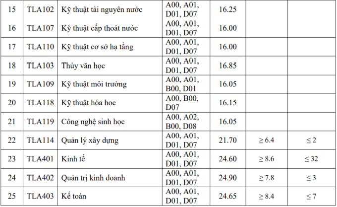 | Kỹ thuật tài nguyên nước | TLA 102 | 42 | 18 | A00, A01, D01, D07 |