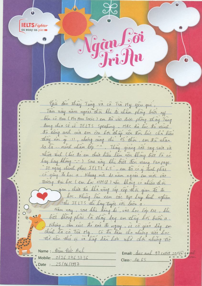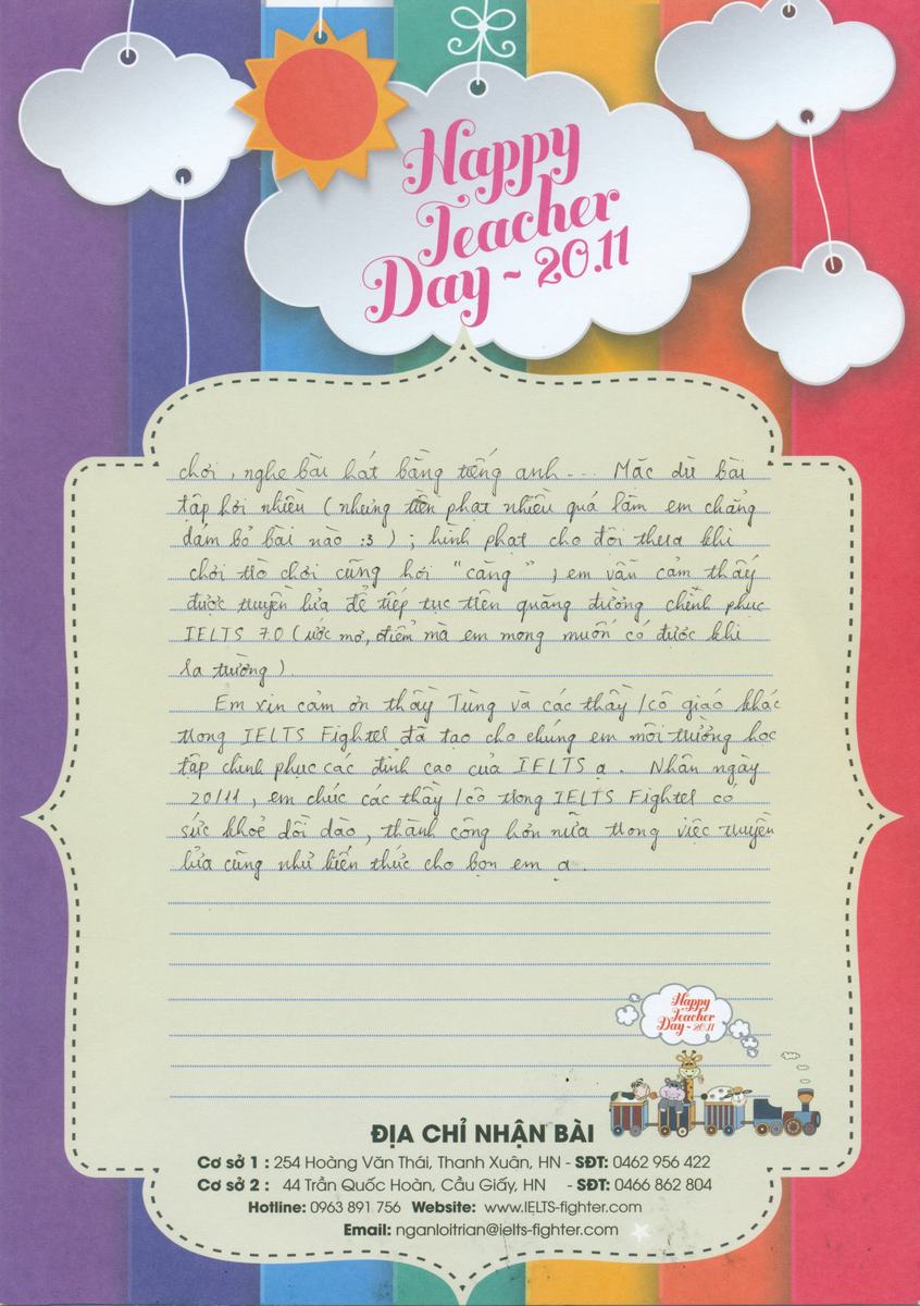 ...Năm nay, sau khi đăng ký vào học lớp Pre IELTS, biết không phải thầy Tùng dạy em thực sự thấy hơi buồn. Nhưng cảm xúc đó đã được xóa đi ngay, bởi vì cô giáo dạy em chính là cô Trà My. Cô đã làm cho những tiết học trở nên thú vị và hấp dẫn hơn nhờ những trò chơi, nghe bài hát bằng tiếng Anh...