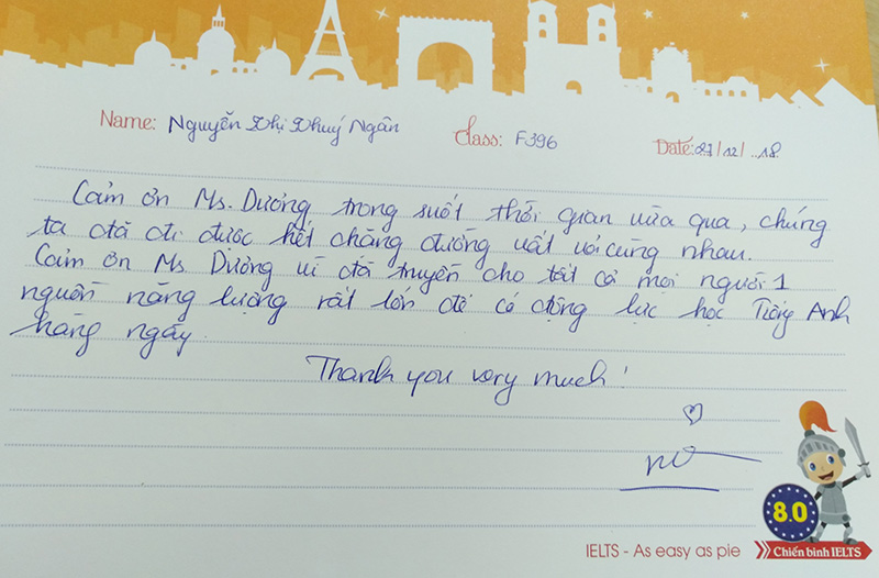 Sau thời gian luyện thi IELTS tại trung tâm, các bạn học viên lớp F396 đã chia tay nhau. Có bạn tiếp tục lớp học mới nhưng có bạn vì bận việc nên tự học tại nhà nhưng với tất cả Ms.Dương là No.1, thời gian học tập tại trung tâm là sẽ không bao giờ quên được. Điều đó thể hiện ở những tâm thư "lưu trữ" cùng IELTS Fighter.