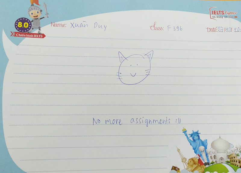 Xuân Duy: " No more assignments " Có vẻ như nhiều bài tập về nhà nên bạn Duy đang kêu ca. Nhưng icon mặt cười này chỉ là sự giận dỗi dễ thương mà thôi. Hãy chăm làm thêm bài tập nhé Duy để tăng kiến thức nha!