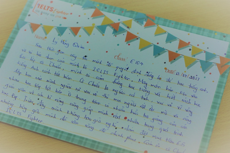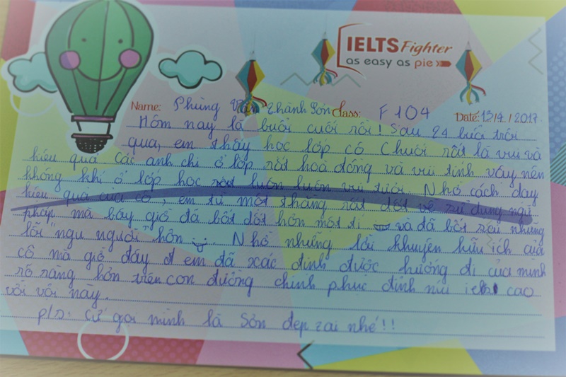 Là một trong những học viên nổi bật của lớp, Đinh Tuấn Hiệp tâm sự: “Sau một thời gian học tập tại Trung tâm, tôi cảm nhận khả năng học tiếng Anh của bản thân tăng lên khá nhiều. Tôi đã có thể tự tin giao tiếp, đọc, viết được nhiều văn bản tiếng Anh hơn. Xin cám ơn đội ngũ tư vấn viên, giáo viên và trợ giảng tại IELTS Fighter, đặc biệt là cô “Chuối” đã ân cần giảng dạy cho em trong thời gian qua ^^ Đây sẽ là kỷ niệm đáng nhớ trong cuộc đời em ?”