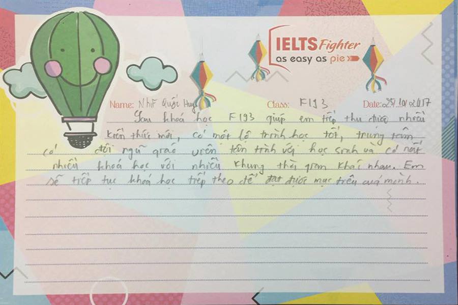 | *** Xem thêm chia sẻ từ các bạn học viên khác của IELTS Fighter tại đây: - F199 - Cảm ơn cô Bảo Kim đã truyền động lực học tiếng Anh cho em và giúp em học tập tiến bộ hơn rất nhiều - Pre 186B: Cảm ơn IELTS Fighter đã đưa em tới gặp Pre 186B và Boss Trà My - F104 Vũ Hồng Quân: “Trước đây mình không bao giờ nghĩ sẽ đạt mục tiêu 6.5" |
