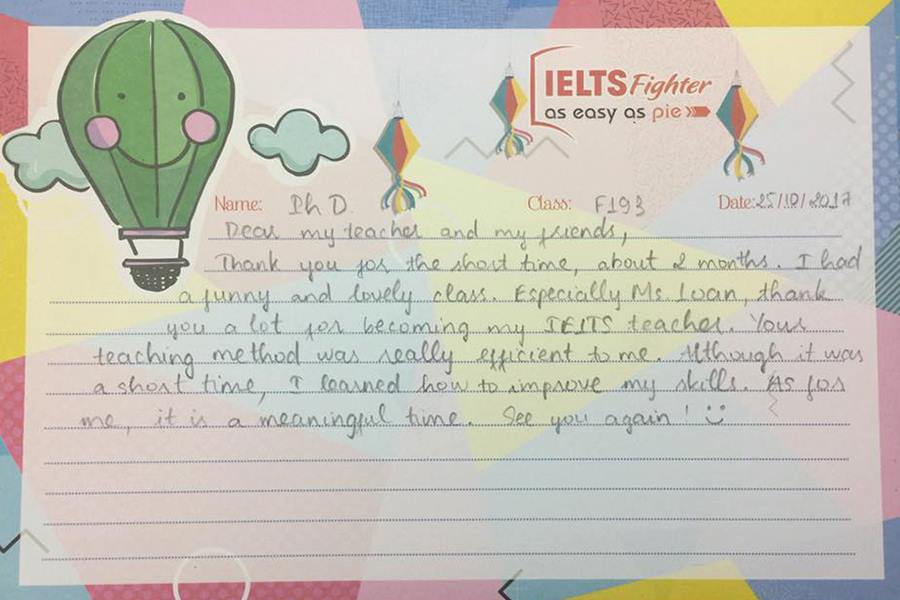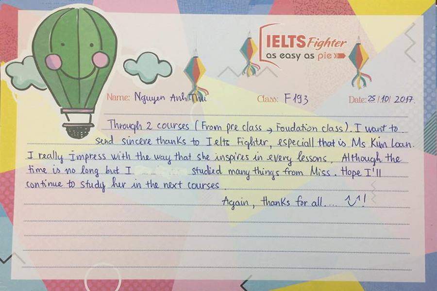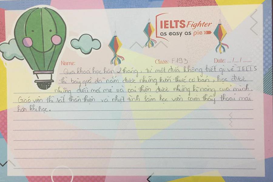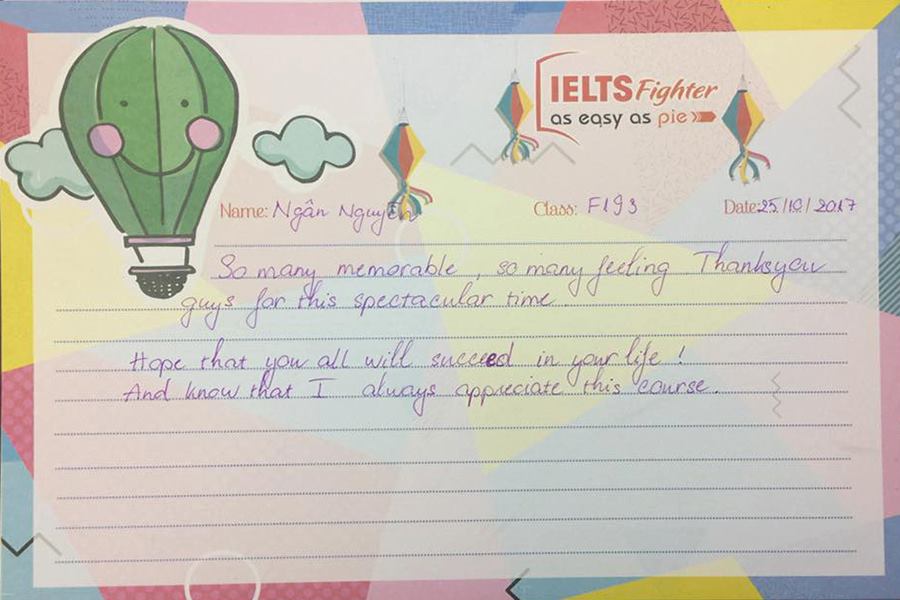 Tuy chỉ học cùng nhau trong quãng thời gian không dài nhưng đã để lại biết bao những kỉ niệm đáng nhớ của tập thể Pre193 cùng Ms Kim Loan. Hãy cùng IELTS Fighter lắng nghe những chia sẻ của các bạn học viên sau thời gian học tập tại trung tâm nhé!
