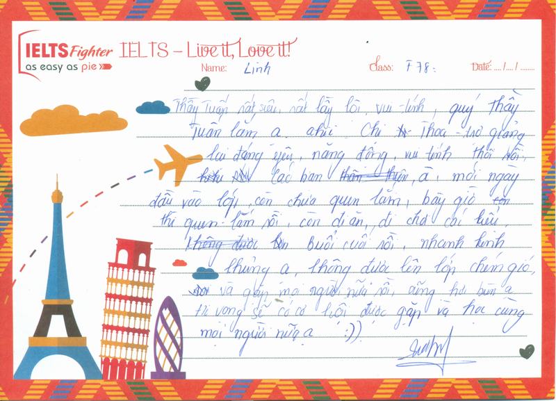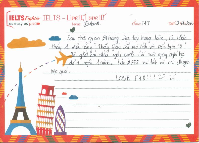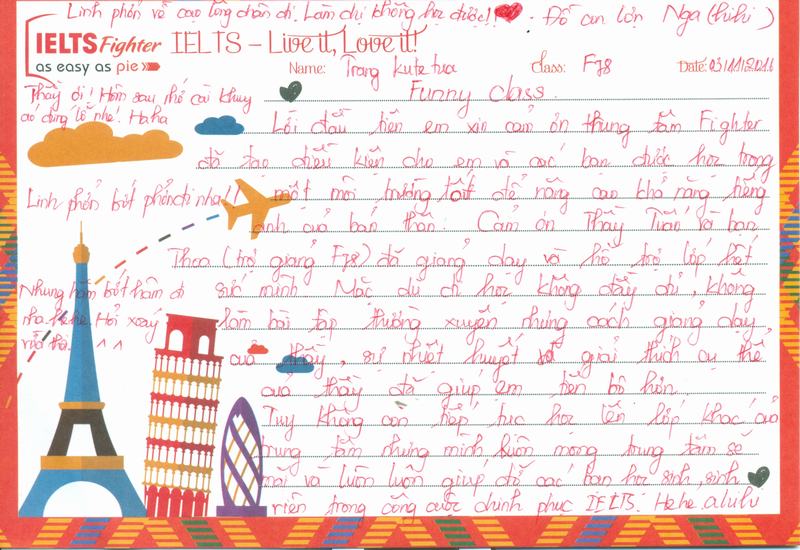 Lời đầu tiên em xin cảm ơn trung tâm Fighter đã tạo điều kiện cho em và các bạn được học trong một môi trường tốt để nâng cao khả năng tiếng Anh của bản thân. Cảm ơn thầy Tuấn và bạn Thoa (trợ giảng F78) đã giảng dạy và hỗ trợ lớp hết sức mình. Mặc dù đi học không đầy đủ, không làm bài tập thường xuyên nhưng cách giảng dạy của thầy, sự nhiệt huyết và giải thích cụ thể của thầy đã giúp em tiến bộ hơn.