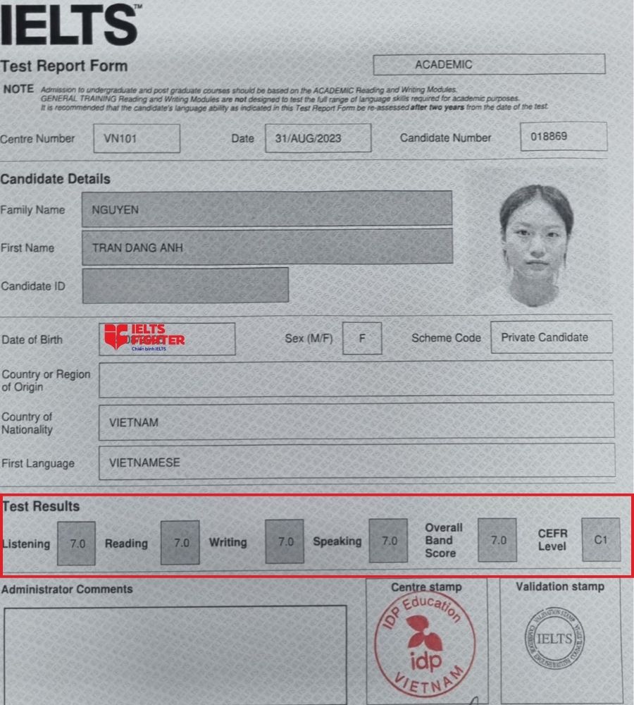 Mình nhận kết quả hôm 05/09/2023, thi ở IDP Hai Bà Trưng hôm 31/8 và có thể nói điểm cũng nằm trong mức mình aim rồi. Tuy vẫn hơi tiếc một tẹo vì Lis với Read thấp quá nhưng bù lại điểm Speak và Write just like a dream come true sau 2 tháng. Thi xong Speak mình đã nhắn ngay cho chị Tutor để kể mình đã self-corrected nhiều như thế nào và mình tưởng mình đã rớt aim ngay lúc đó. Nhưng không uổng công 2 tháng luyện Intensive Speaking và Writing cùng cô Nguyễn Trang siêu ngầu, ai ngờ hai kỹ năng này lại là nhân tố "gánh" điểm overall của mình.
