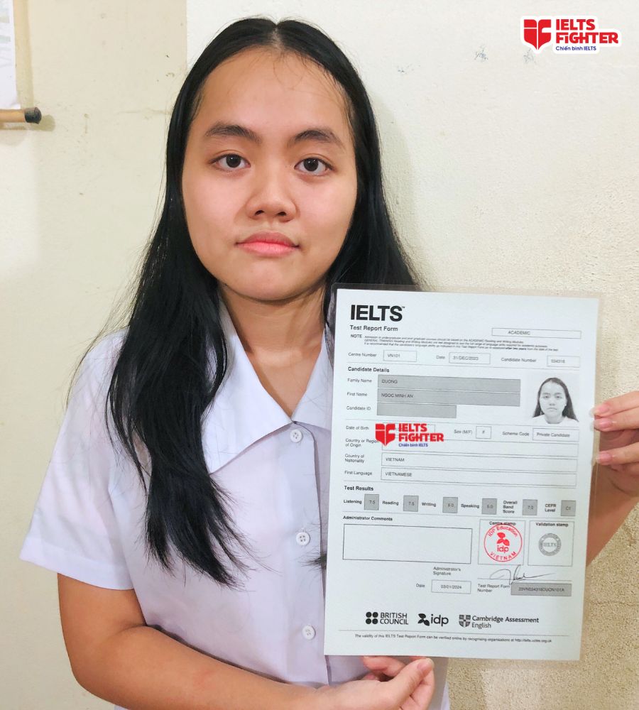 Chào mọi người em là Dương Ngọc Minh An, em là học viên tại cơ sở IELTS fighter Phan Đăng Lưu. Em đăng ký thi IELTS trên máy ngày 31/12 vừa rồi tại cơ sở IDP đường Hai Bà Trưng và nhận được kết quả theo đúng mong muốn, em xin chia sẻ vài lời về quá trình luyện thi của mình.