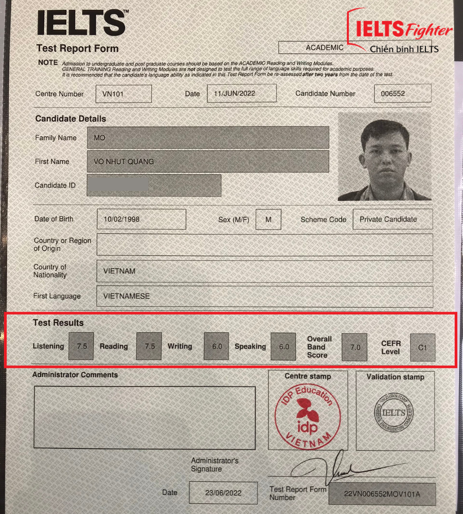 | Vinh danh học viên: ✪ Họ tên: Mô Võ Nhựt Quang ✪ Overall: 7.0 IELTS ✪ Read-7.5, Lis-7.5, Wri-6.0, Speak-6.0 ✪ Học viên lớp: B22748 |