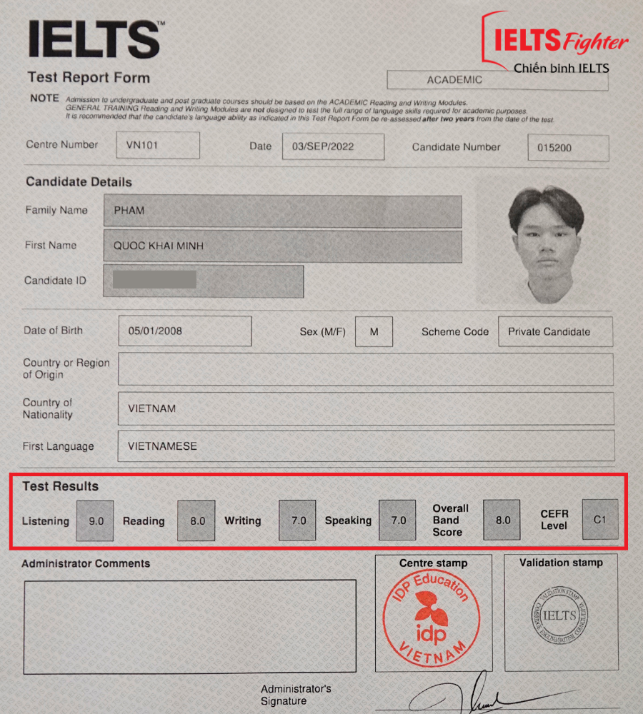 | Vinh danh học viên: ✪ Họ tên: Phạm Quốc Khải Minh ✪ Overall: 8.0 IELTS ✪ Read-8.0, Lis-9.0, Wri-7.0, Speak-7.0 ✪ Học viên lớp: B24999 ✪ Học sinh lớp 9 trường THCS Hoàng Văn Thụ |