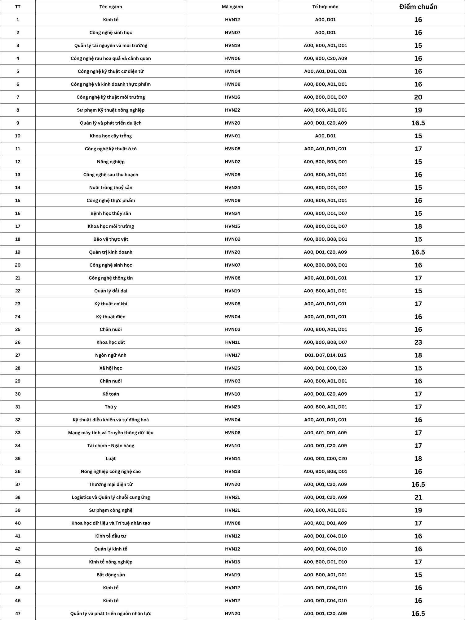 | HVN06 – Công nghệ rau hoa quả và cảnh quan | A00, C04, D01, D10 | Công nghệ rau hoa quả và cảnh quan |