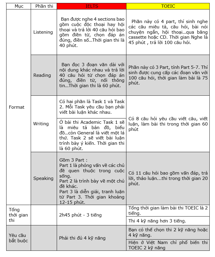 Vì TOEIC thi ở Việt Nam thường chỉ là 2 kỹ năng nên chúng ta chỉ so sánh theo hai kỹ năng này. Sau đây chúng ta sẽ đi từng điểm cụ thể.