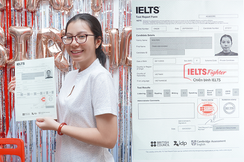 Đặt mục tiêu ban đầu là 6.0+ IELTS cho việc xét tuyển Đại học, Minh Kiên- Học sinh THPT Nguyễn Chí Thanh sau một hồi tìm hiểu thông tin các trung tâm luyện thi đã theo lời 1 người bạn cùng lớp đến tham khảo khóa học tại IELTS Fighter Cộng Hòa. Theo học từ tháng 9/2020 đến tháng 4 vừa rồi cậu bạn đã chính thức bứt phá bản thân mang về cho mình điểm số 7.0 đầy ấn tượng.