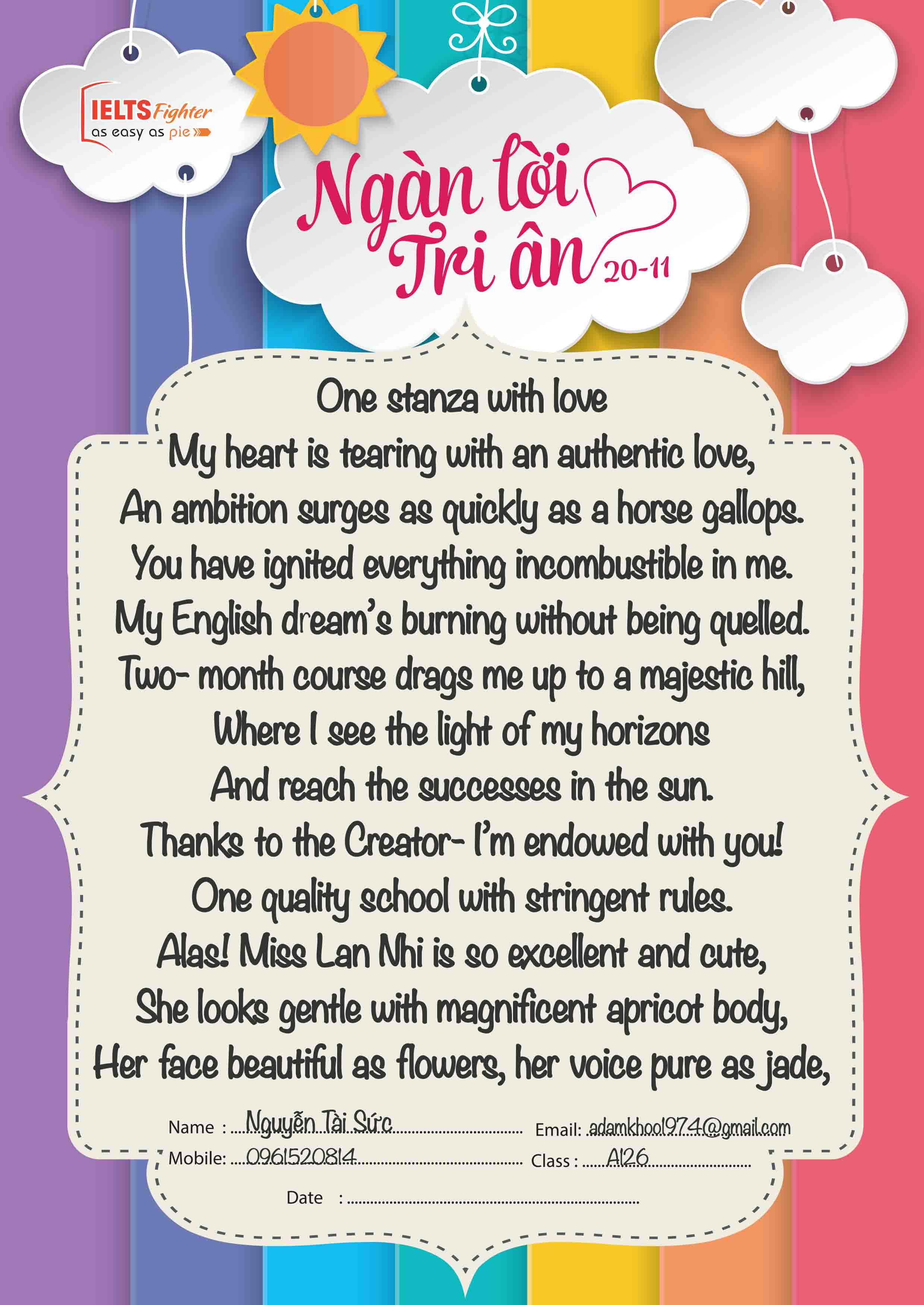 Chi tiết thể lệ và giải thưởng xem tại: https://ielts-fighter.com/tin-tuc/Cuoc-thi-34-Ngan-loi-tri-an-2017-34-Chao-mung-ngay-Nha-giao-Viet-Nam-20-11_mt1509461191.html