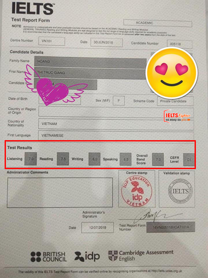 Chúc mừng Trúc Giang với thành tích ấn tượng 7.0 IELTS. Chúc Giang nhiều niềm vui và thành công trong sự nghiệp phía trước. Tin chắc rằng, với sự tự tin và chăm chỉ, cánh cửa nghề nghiệp sẽ luôn rộng mở đến với em!