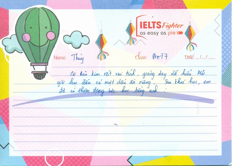Về lớp IELTS Pre77, trong giờ học cũng như ngoài giờ, cô Kim và trợ giảng rất nhiệt tình, vui tính, luôn tạo cho học viên, cho mình sự thoải mái khi học tiếng Anh. Những câu chuyện cô "chế" về mình: vụ đánh ghen, tiểu sử bla bla đều làm mọi người trong lớp vui vẻ, phấn khích trong lúc học.