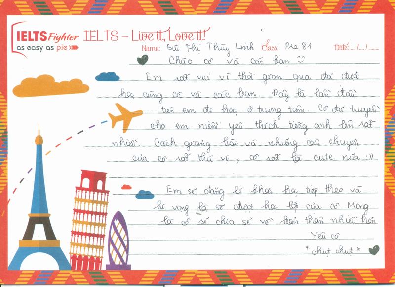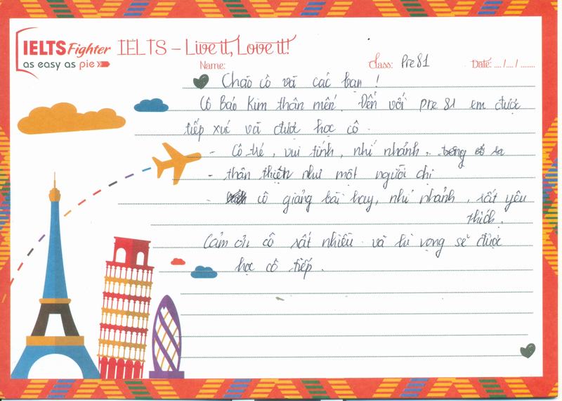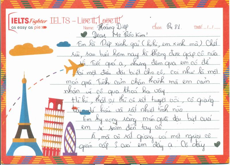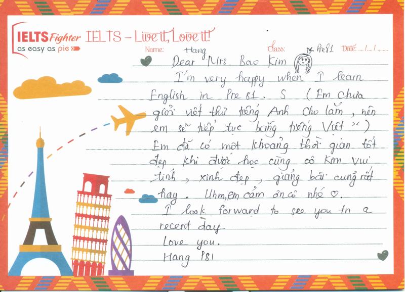 I'm very happy when I learn English in Pre81. (Em chưa giỏi viết thư tiếng Anh cho lắm, nên em sẽ tiếp tục bằng tiếng Việt ><). Em đã có một khoảng thời gian tốt đẹp khi được học cùng cô Kim vui tính, xinh đẹp, giảng bài cũng rất hay. Uhm, em cảm ơn cô nhé! <3