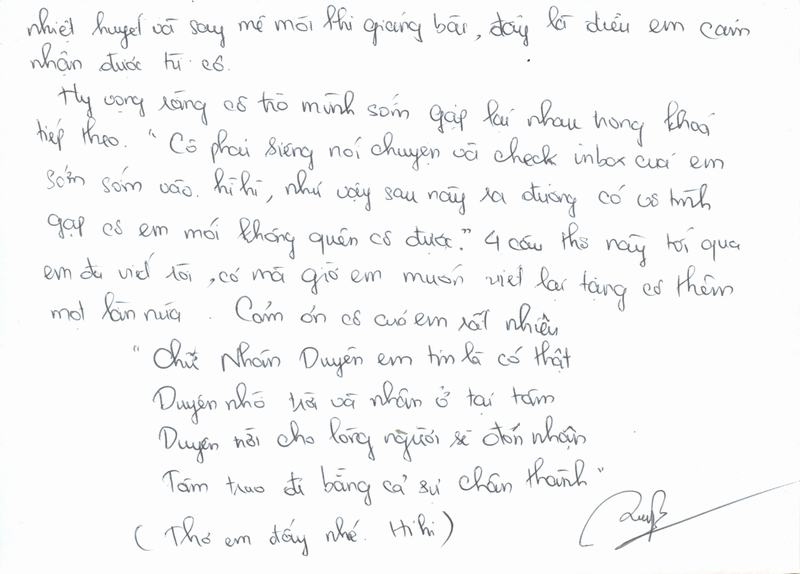 Hy vọng rằng cô trò mình sớm gặp lại nhau trong khóa học tiếp theo. "Cô phải siêng nói chuyện và check inbox của em sớm sớm vào, hì hì, như vậy sau này ra đường có vô tình gặp cô em mới không quên cô được. 4 câu thơ này tối qua em đã viết rồi, cơ mà giờ em muốn viết lại tặng cô thêm một lần nữa. Cảm ơn cô của em rất nhiều.