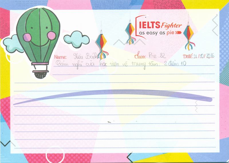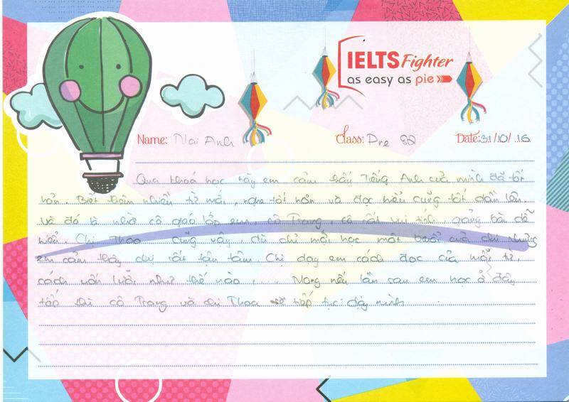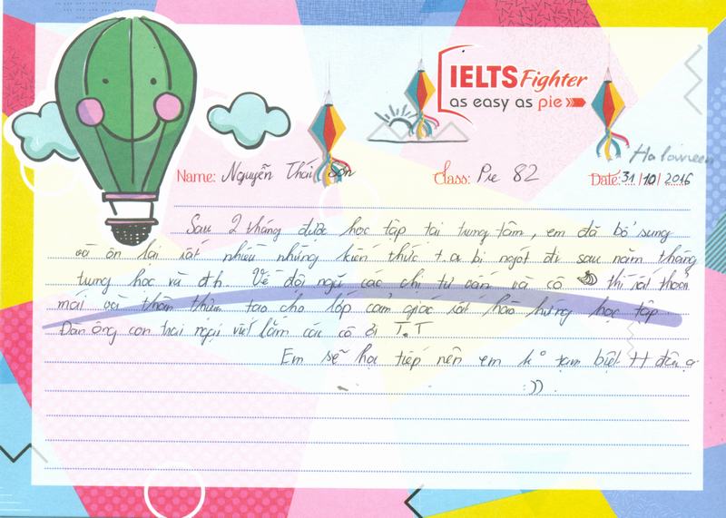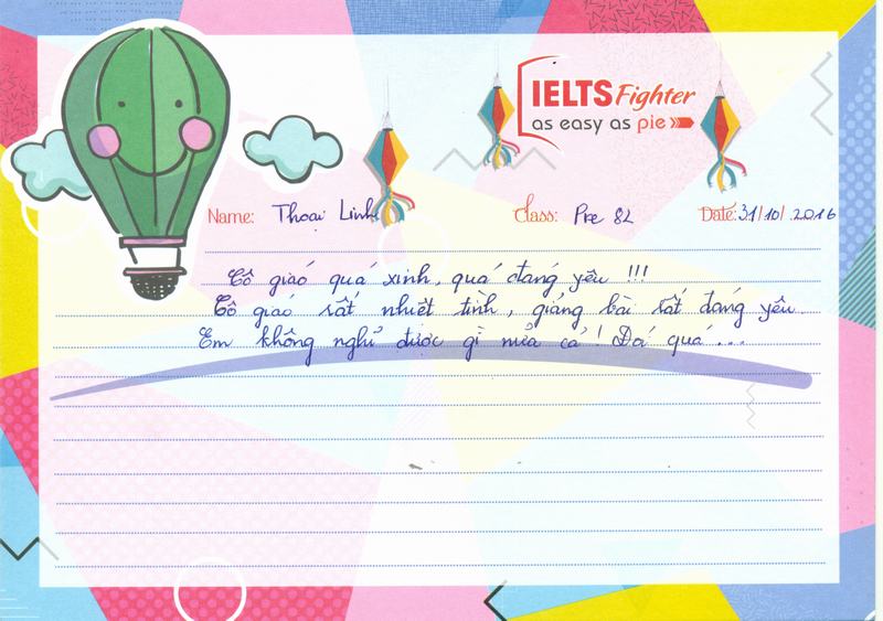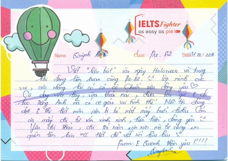 Hôm nay là ngày Haloween, trời lạnh, tắc đường, em có đôi lời gửi đến trung tâm IELTS Fighter. Cách hoạt động của trung tâm rất chuyên nghiệp, từ các chị tư vấn, cho đến trợ giảng, rồi cả cô giáo đều rất tận tình trong công việc. là một học viên, em thấy rất hài lòng khi theo học tại đây. Em rất mong sẽ được học những khóa tiếp theo tại trung tâm.