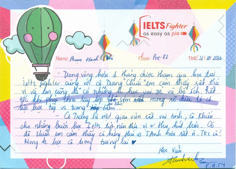 - Trong vòng hơn 1 tháng được tham gia học tại IELTS Fighter cùng với cô Trang chuối em cảm thấy rất thú vị và em cũng đã có những giờ học vui vẻ và bổ ích. Rất tiêc khi phải chia tau lớp khá sớm, mong sẽ được có cơ hội học tiếp với trung tâm.
