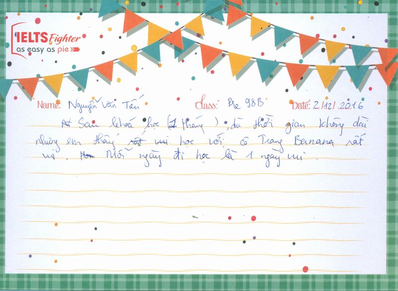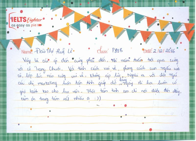 Vậy là buổi học cuối cùng cũng đã đến sau 1 tháng học tại IELTS Fighter. Sau 1 tháng học tập cùng cô Trang Banana và các bạn cute trong lớp, em đã học tập được nhiều điều bổ ích. Em sẽ tiếp tục học lên các khóa tiếp theo.