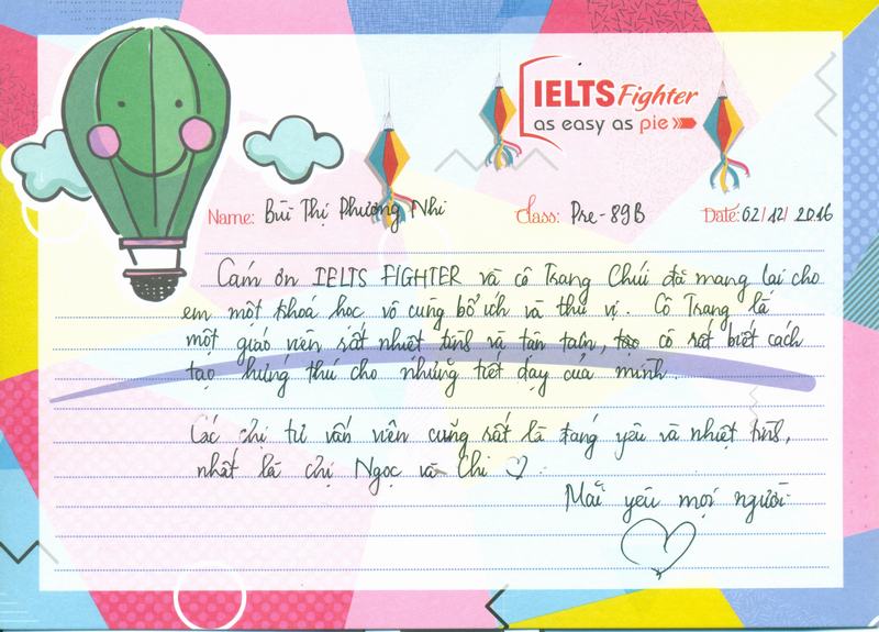 Cảm ơn IELTS Fighter và cô Trang Chúi đã mang lại cho em một khóa học vô cùng bổ ích và thú vị. Cô Trang là một giáo viên rất nhiệt tình và tận tâm, cô rất biết cách tạo hứng thú cho những tiết dạy của mình.