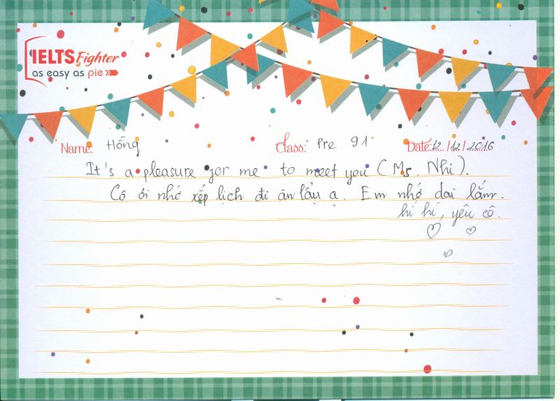 Hmm... biết nói gì bây giờ nhỉ? Khóa học của bạn em với cô đã kết thúc rồi. Mới đầu vào lớp em hơi ngại với nhát vì tiếng Anh trên lớp của em vốn không được tốt lắm. Khi học buổi đầu tiên em rất thích cách dạy của cô, vì em luôn muốn được nghe tiếng Anh nói ngoài đời sống chứ không phải qua băng đĩa hay phim, cũng thích cả con người của cô luôn, kiểu nó cứ "truất" ý ạ... hì hì. Do lười với lại năm cuối cấp, gần thi học kỳ nên thời gian khá hạn chế với lại đi đường xa nên lười làm bài. Nói chung là yêu cô Nhi lắm luôn.