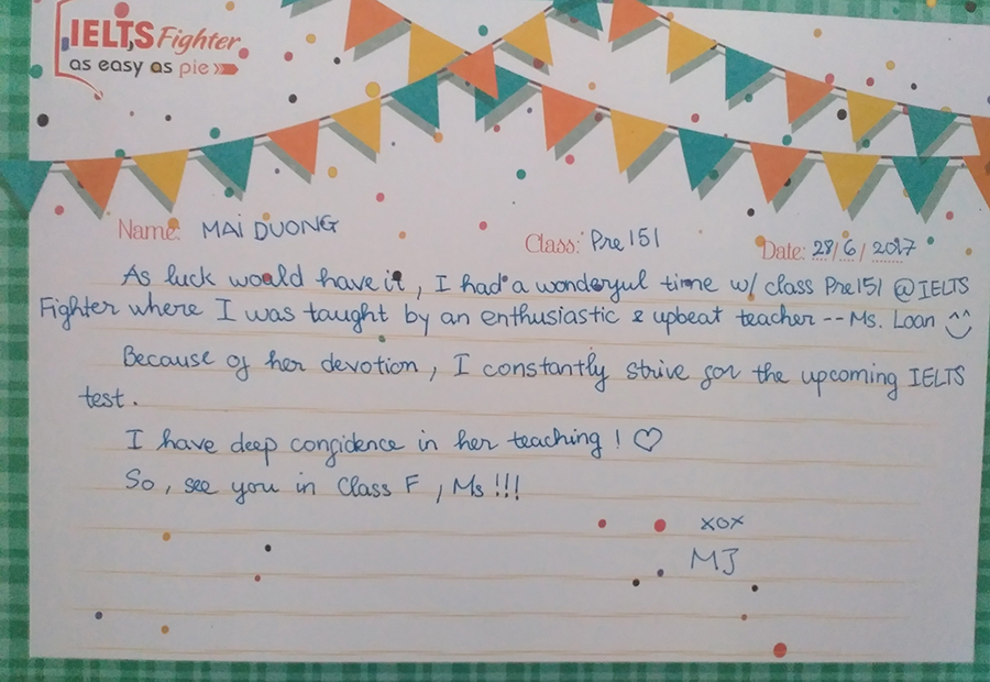 Mai Duong: “As luck would have it, I had a wonderful time w/ class Pre151 @ IELTS Fighter where I was taught by an enthusiastic & upbeat teacher – Ms Loan ^^
