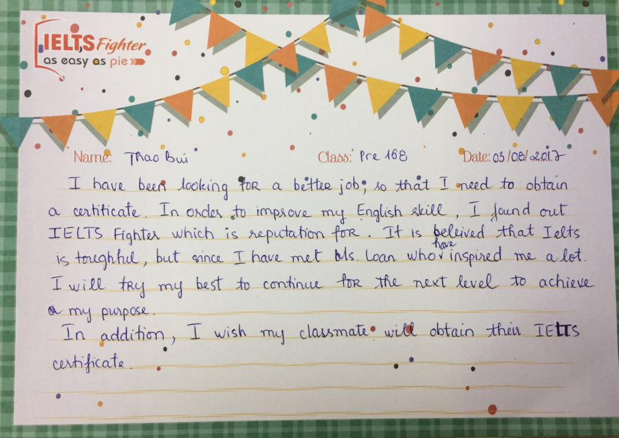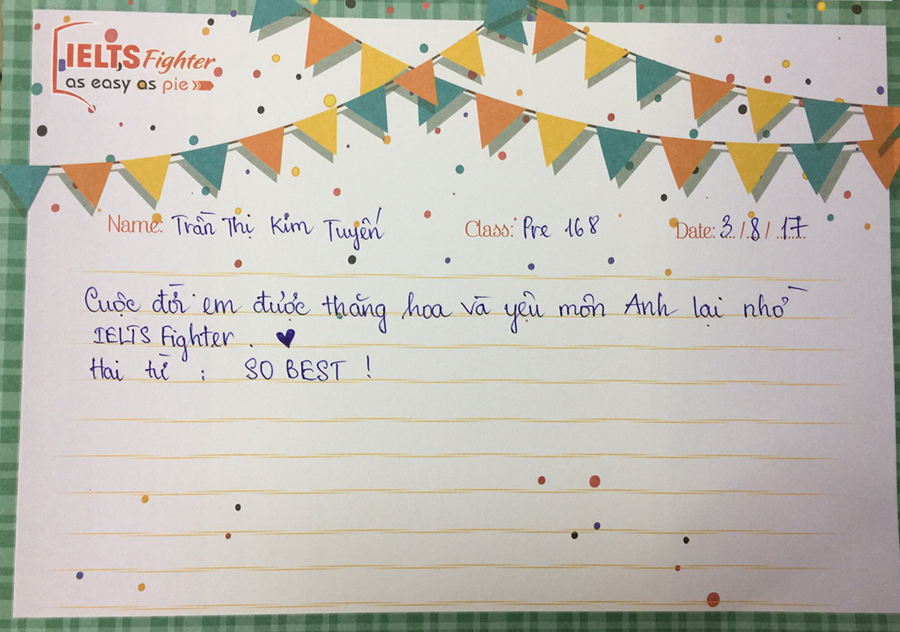 Em cảm thấy rất vui khi được học tại IELTS Fighter. Qua hơn 1 tháng học tại trung tâm em thấy mình được tiếp xúc với tiếng Anh qua nhiều kỹ năng và đặc biệt là được học chung với nhiều bạn bè mới.