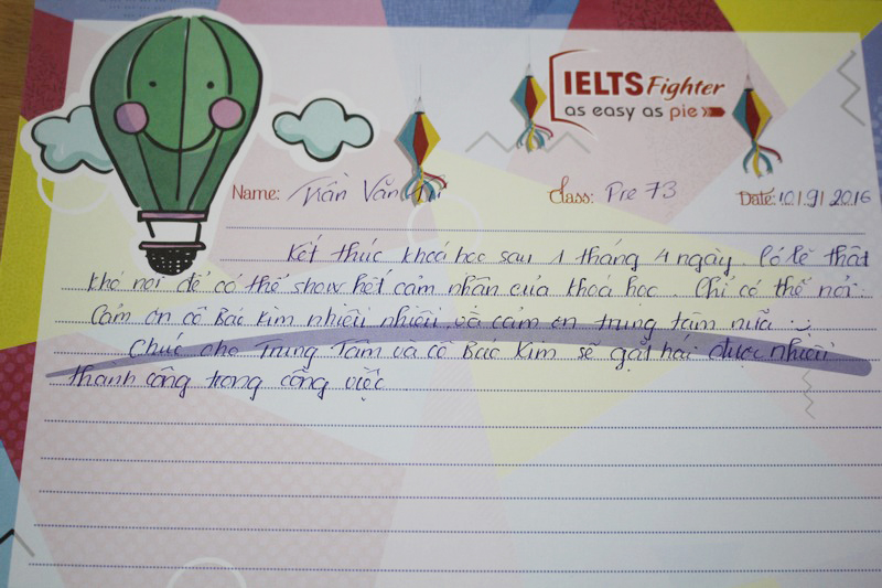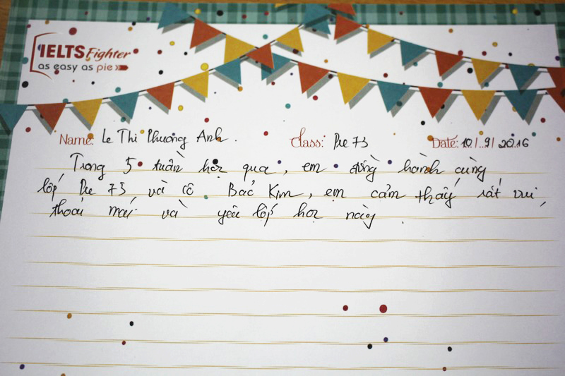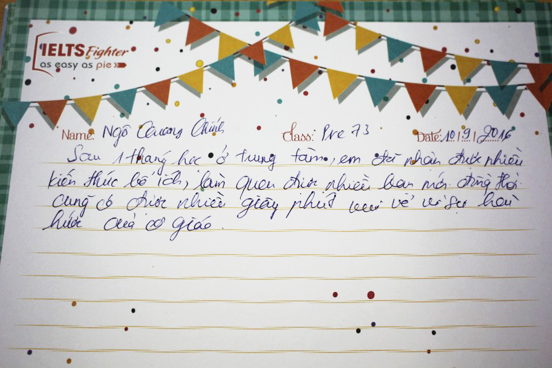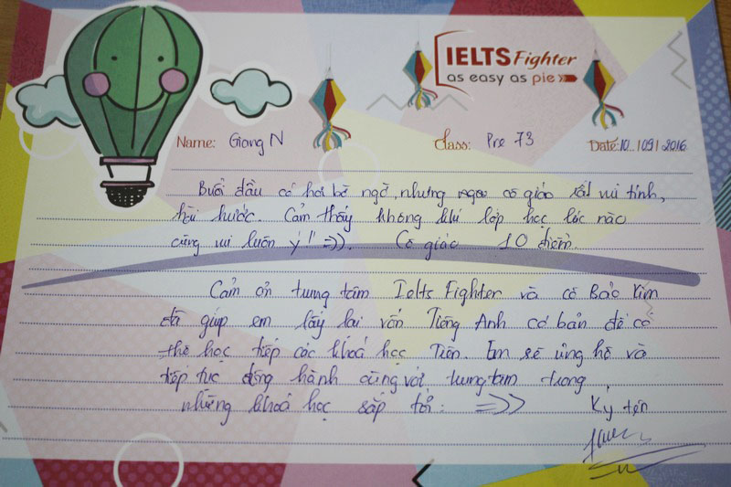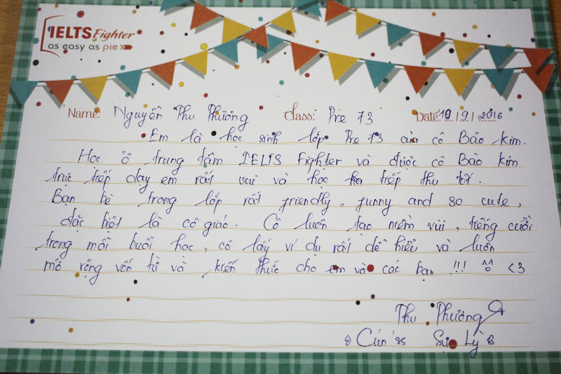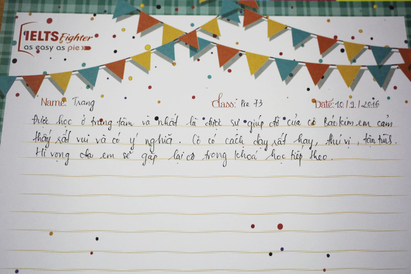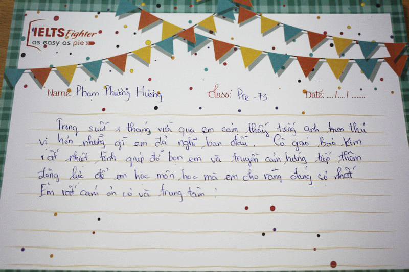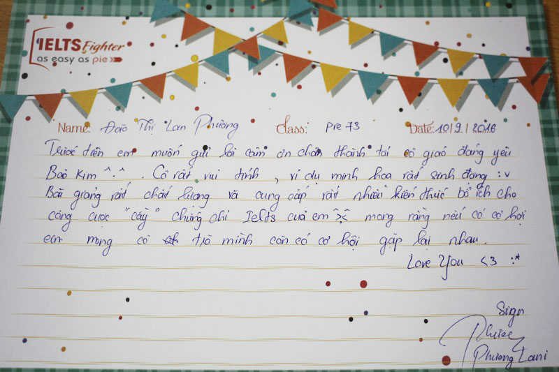 Cảm ơn trung tâm IELTS Fighter và cô Bảo Kim đã giúp em lấy lại vốn tiếng Anh cơ bản để có thể học tiếp các khóa học trên. Em sẽ ủng hộ và tiếp tục đồng hành cùng với trung tâm trong những khóa học sắp tới.