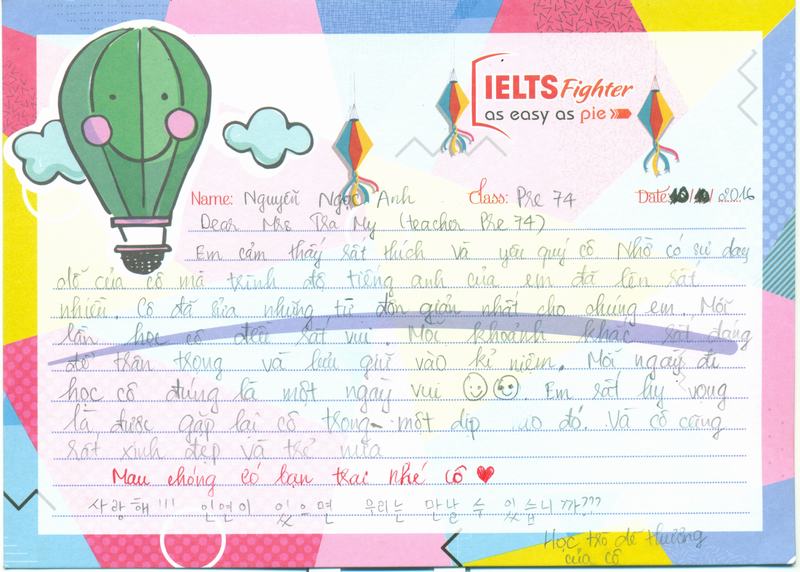 Sau 16 buổi học, là một thời gian ngắn, nhưng em có một khoảng thời gian rất vui tại lớp Pre74 và với cô. Đối với em, cô là cô giáo dạy tiếng Anh hay nhất em được học, ban đầu vào lớp em có chút sợ sệt và ngại ngùng nhưng nhờ sự nhiệt tình của cô và sự cởi mở của các bạn khiến em thoải mái hơn nhiều. Em rất thích giọng nói của cô, rất hay và truyền cảm hứng cho em. Em sẽ cố học nói tiếng Anh để nói giỏi như cô. Chắc là em sẽ nhớ cô hơn cả các bài đã được học cô ạ!