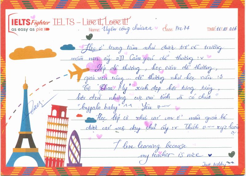Lời đầu tiên, Em muốn gửi lời cảm ơn tới trung tâm tiếng Anh IELTS Fighter đã thành lập một môi trường học tập tiếng Anh khoa học và bổ ích.