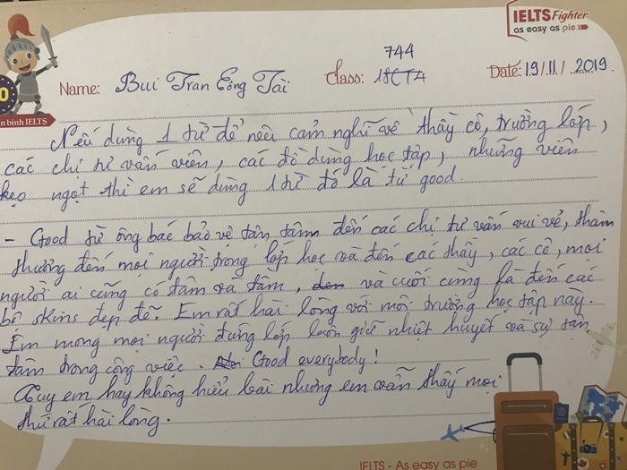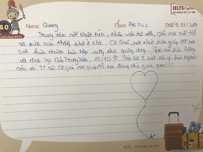 Bạn Xuân Dung chia sẻ: "Vô tình được biết IELTS Fighter qua FB. Em đã tìm hiểu và quyết định đăng ký học tại đây. Ngày học đầu tiên em cảm thấy rất lạ lẫm và hơi rụt rè, nhưng đến buổi thứ 3 thì hào đồng với mọi nguời hơn. Cô An rất hiền và siêu cute, luôn chỉ dạy tận tình cho học sinh. Mỗi ngày đi học là một ngày vui. Sau 1 tháng rưỡi bên nhau, bên cả lớp, cô gáo, mọi người coi nhau như người trong nhà.Cảm ơn IELTS Fighter đa giúp em gặp được những người bạn mới và gặp được cô giáo An siêu siêu siêu siêu siêu siêu siêu CUTE và TẬN TÌNH."
