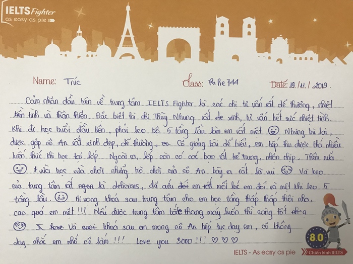 Bạn Trúc chia sẻ: "Cảm nhận đầu tiên về trung tâm IELTS Fighter là các chị tư vấn rất dễ thương, nhiệt tình và thân thiên. Đặc biệt là chị Thùy Dung rất xinh, tư vấn hết sức nhiệt tình.Khi đi học buổi đầu tiên, phải leo bộ 5 tầng lầu làm em rất mệt nhưng bù lại được gặp cô An rất xinh đẹp, dễ thương. Cô giảng bài dễ hiểu, em tiếp thu được khá nhiều kiến thức khi học tại lớp. Ngoài ra, lớp còn có các bạn rất trẻ trung, nhộn nhịp. Thêm nữa vừa học vừa chơi những trò chơi của cô An bày ra rất là vui. Và kẹo của trung tâm rất là delicious, đã cứu mỗi lúc em đói và mệt khi leo 5 tầng lầu. Hi vọng khóa sau trung tâm cho em học tầng thấp thấp thôi nha,cao quá em mệt!!! Nếu được trung tâm bắc thang máy luôn thì càng tốt ạ. :) Và khóa sau em mong cô An tiếp tục dạy em, cô không dạy chắc em nhớ cô lắm!!! Love you 3000!!! "