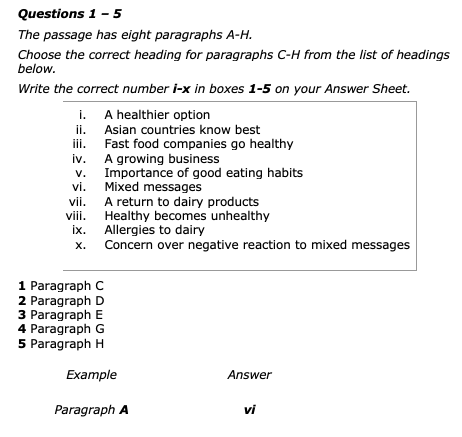Có điểm chung dễ nhận ra là “healthy” đúng không nào! Vậy bạn đọc đoạn C xong, nếu không phải là một trong những Headings còn lại, mà nội dung liên quan đến “healthy” thì hãy loại trừ 1 trong 3 câu trả lời trên nhé (i, iii và viii). Tương tự, “vi” và “x” có thể ghép cặp lại vì có “mixed messege”. Hoặc “vii” và “ix” có thể ghép thành 1 cặp vì có “dairy”