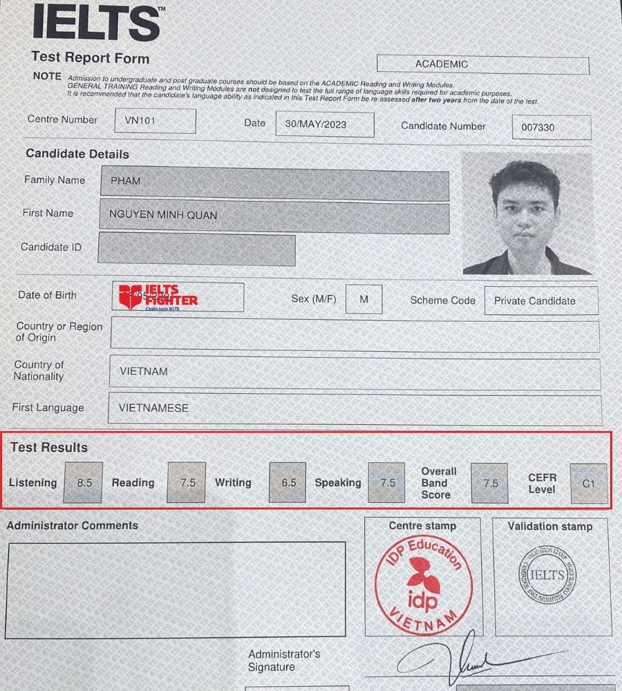 “Chào mọi người, mình tên là Quân, mình đã học qua các lớp A, B và luyện đề ở cơ sở Nguyễn Thị Minh Khai, quận 3. Vừa qua mình đã thi và đạt dc 7.5 overall, trong đó ảo nhất là Speaking mình dc 7.5 (lúc đầu mình không tự tin là mình sẽ được điểm cao như vậy). Phải công nhận rằng các thầy đã góp 1 phần không nhỏ vào thành công của mình.