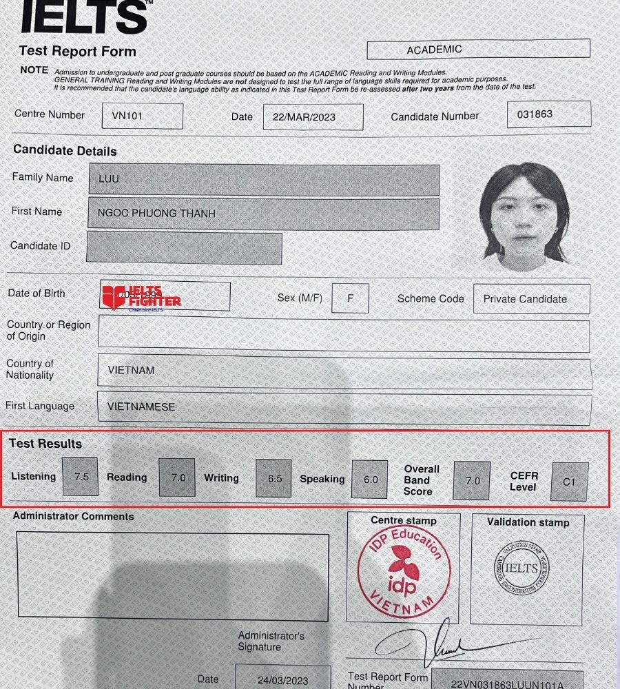 Trải qua lớp luyện đề 1 kèm 1 cùng thầy Hoàng, Minh Thanh đã gặt hái được thành quả 7.0 IELTS, tăng hẳn 1 band so với trước khi theo học tại IELTS Fighter.