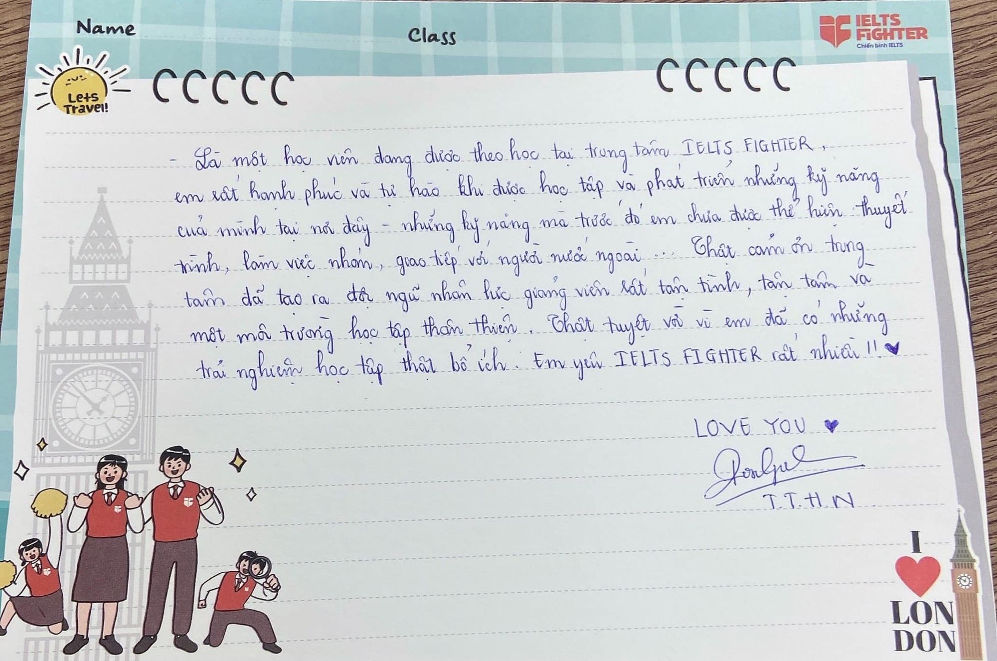 "Là một học viên đang được theo học tại trung tâm IELTS Fighter, em rất hạnh phúc và tự hào khi được học tập và phát triển những kỹ năng của mình tại nơi đây - những kỹ năng mà trước đó em chưa được thể hiện như: thuyết trình, làm việc nhóm, giao tiếp với người nước ngoài… Thật cảm ơn trung tâm đã tạo ra đội ngũ nhân lực giảng viên rất tận tình, tận tâm và một môi trường học tập thân thiện. Thật tuyệt vời vì em đã có những trải nghiệm học tập bổ ích. Em yêu IELTS FIGHTER rất nhiều!! <3 <3"