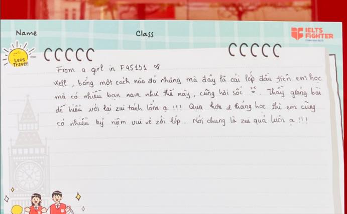 Những bức thư tay nhận được từ các bạn học viên đã truyền cảm hứng rất lớn cho thầy cô và toàn bộ đội ngũ IELTS Fighter. Cùng chúng mình lắng nghe nhé!