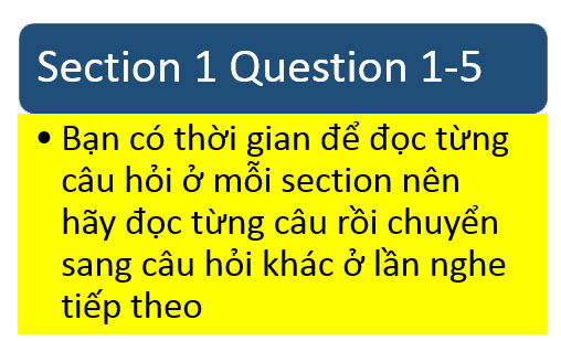 Khi bước vào từng section, bạn cũng có thời gian để đọc câu hỏi trước theo hướng dẫn của người nói. Và khi đó, bạn tập trung vào câu hỏi mà mình cần làm theo từng section thật kỹ là được.