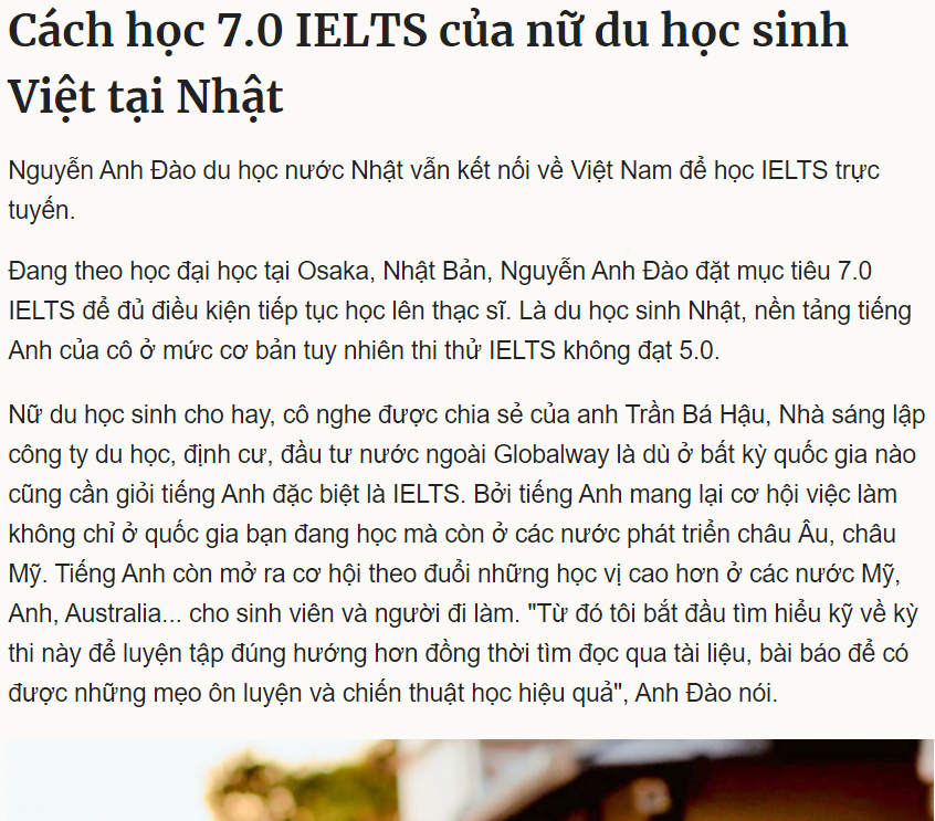Chi tiết bài chia sẻ của Anh Đào: https://vnexpress.net/cach-hoc-7-0-ielts-cua-nu-du-hoc-sinh-viet-tai-nhat-4339864.html