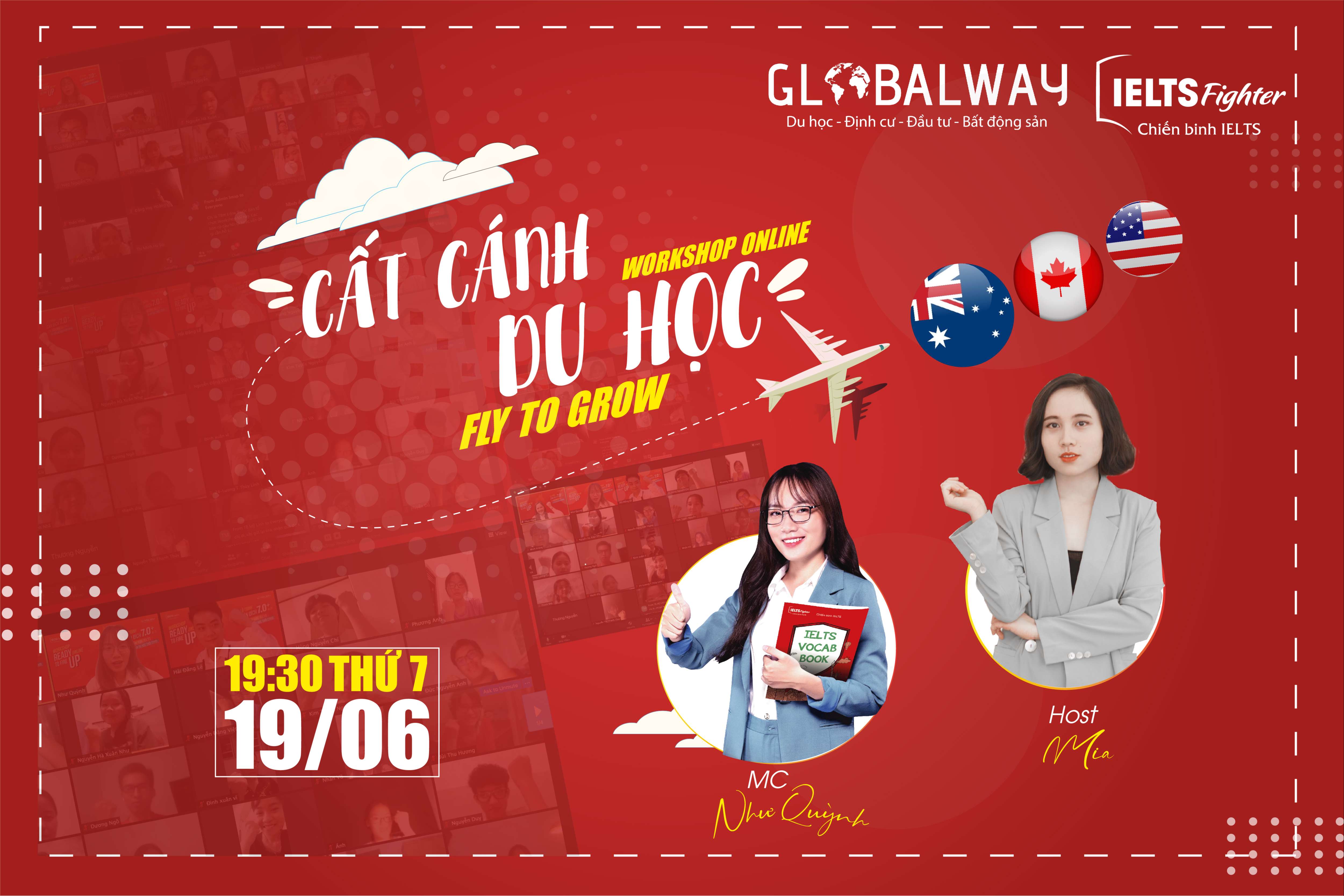 Tiếp nối sự thành công rực rỡ của Workshop Ready To Fire Up tháng 5 vừa qua, IELTS và Globalway sẽ đồng hành cùng nhau trong Workshop “ Cất cánh du học - Fly to grow” vào ngày 19/06/2021 với sự tham gia của hàng trăm học sinh, phụ huynh có con em mong muốn đi du học các nước Úc, Canada,... trong thời gian sắp tới.